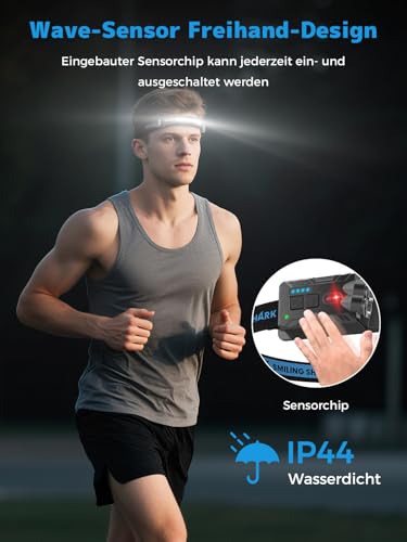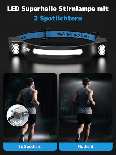 Smiling Shark Kopflampe, 2400mAh Ultra-Helle Wiederaufladbare Headlamp Weißes Licht & 2*Scheinwerfer Mit Bewegungsmelder Multi-Mode LED Stirnlampe mit 315°Drehfunktion für Outdoor Camping Wandern