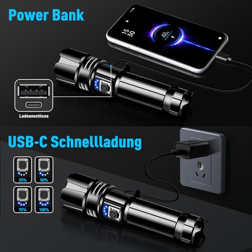 【QUICK CHARGING & USB OUTPUT】Aufladbare Taschenlampe verfügt über eine Eingangs- und Ausgangsladeschnittstelle und einen eingebauten Schnellladechip, die hellste Taschenlampe ist mit einem USB-C-Ladekabel ausgestattet, 3-5 Stunden schnell aufgeladen durch Autoladegerät, Powerbank, Computer oder jede USB-Steckdose. Der Ausgangsanschluss kann als Backup-Stromquelle zum Aufladen Ihres Mobiltelefons oder anderer Geräte während abenteuerlicher Reisen verwendet werden.