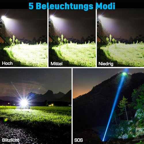 【500000 HIGH LUMEN & SUPER BRIGHT】Taschenlampe hat einen eingebauten XHP70.2 Upgrade-Chip mit einer leistungsstarken 500000 Lumen Leistung, bietet Ihnen die große Lichtwelt, die Sie wollen, leistungsstarke Taschenlampe ist etwa 30 mal heller als gewöhnliche Glühlampen. Helligkeit ist mächtig, so schießen Sie bitte nicht direkt in die Augen.