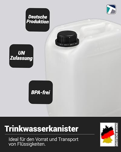 Vielseitig einsetzbar: Unsere Wasserkanister eignen sich nicht nur für den sicheren Transport von Trinkwasser und Lebensmitteln, sondern auch für eine Vielzahl anderer Flüssigkeiten wie Chemikalien und vieles mehr. DIN 45 mit ca. Ø35 mm Einfüllöffnung.