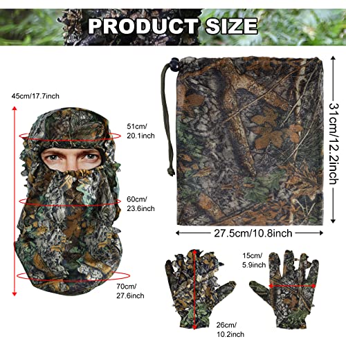 Das Tarnanzug beinhaltet: 1 Stück 3D-Ghillie-Anzugjacke mit grünen Blättern und Kapuze, 1 Stück 3D-Blatt-Ghillie-Anzughose, 1 Paar Handschuhe, 1 Gesichtsmaske, 1 Aufbewahrungstasche. Bitte wählen Sie entsprechend Ihrer Körpergröße und Körperform. Aufgrund der manuellen Messung kann es zu Abweichungen von 1–3 cm kommen